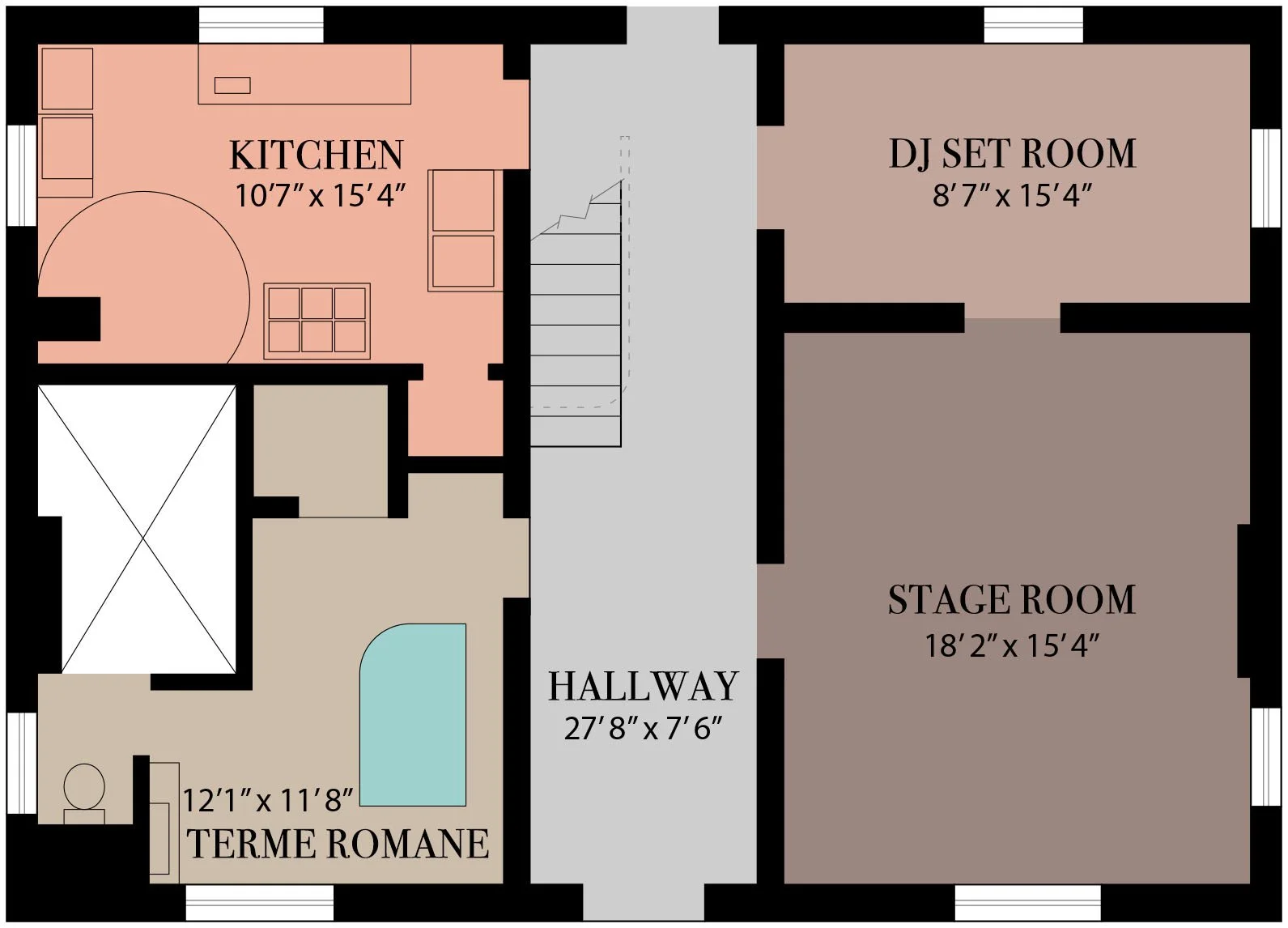 GROUND FLOOR2 Rooms1 Kitchen1 Bathroom Gallery terme romane the kitchen Gallery Gallery stage room dj set room Gallery